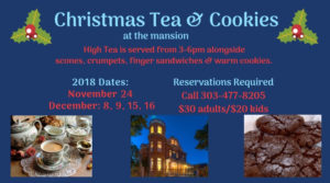 Join us for the 3rd annual “Tea and Cookies” event at the famous Lumber Baron Mansion! We will be serving up a traditional English style High Tea menu, complete with all the traditional trimmings. The mansion will be dressed in her finest attire with photo ops galore! Our holiday tea events always book up quickly – call now to reserve your tradition of holiday magic this year!